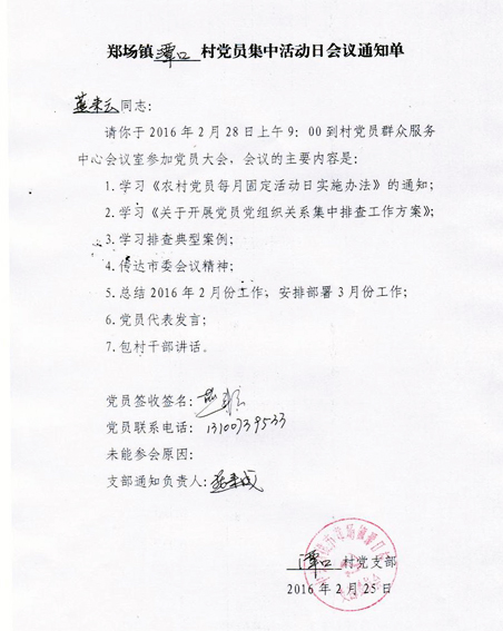 活动当天严格实行签到制度,每名党员会前签到,让党员参加固定活动日情况有据可查。郑场镇统一印制固定活动日通知单,村干部提前两天送达党员本人签字,确保通知不漏一人。